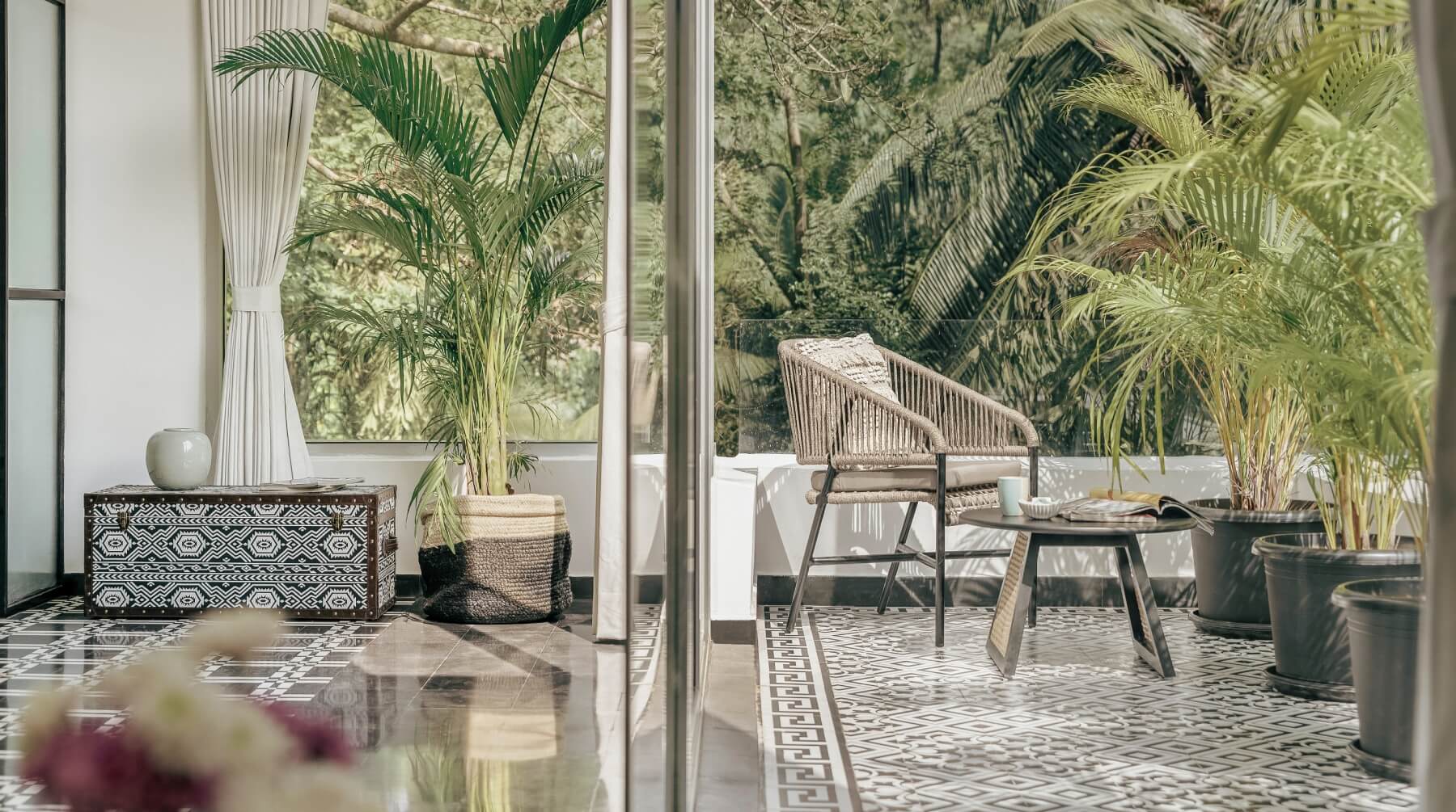 Nestled near Vagator beach, La Zamora offers a luxurious retreat for peace seekers. The living room overlooks a serene garden and private pool, complemented by a beautiful kitchen and dining area.